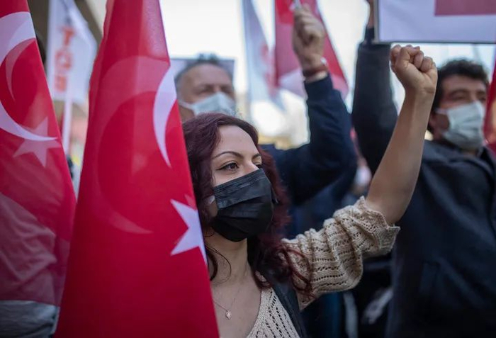 4月26日,土耳其民众在伊斯坦布尔集会抗议美方称亚美尼亚人遭杀害为“种族灭绝”。新华社发(奥斯曼·厄尔萨尔摄)