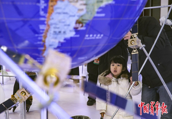 2019年12月21日,北京国家会议中心,第四届国际创新创业博览会会场,一个小女孩被地球各种轨道的卫星模型吸引。中青报·中青网记者 陈剑/摄