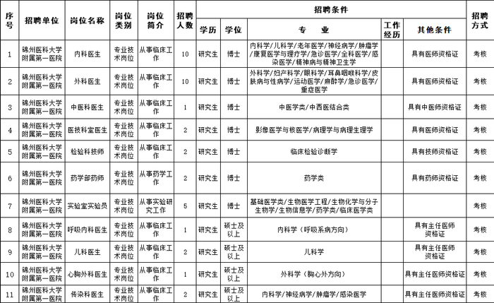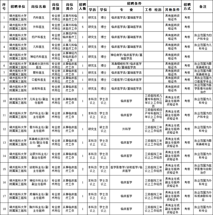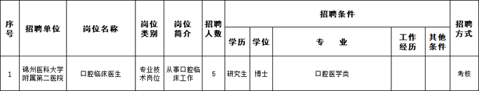 (五)岗位所需要的其他条件,详见《锦州医科大学2021年公开招聘工作人员计划信息表》、《锦州医科大学附属第一医院2021年公开招聘工作人员计划信息表》、《锦州医科大学附属第二医院2021年公开招聘工作人员计划信息表》。