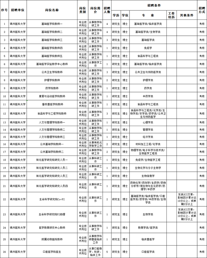 (五)岗位所需要的其他条件,详见《锦州医科大学2021年公开招聘高层次人才计划信息表》、《锦州医科大学附属第一医院2021年公开招聘高层次人才计划信息表》、《锦州医科大学附属第二医院2021年公开招聘高层次人才计划信息表》、《锦州医科大学附属第三医院2021年公开招聘高层次人才计划信息表》。