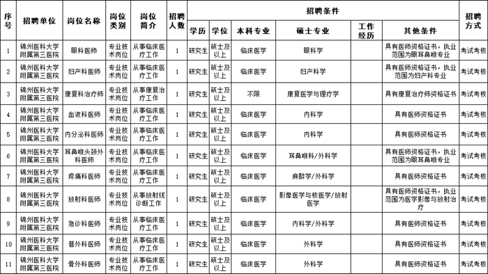 锦州医科大学附属第三医院公开招聘11名工作人员
