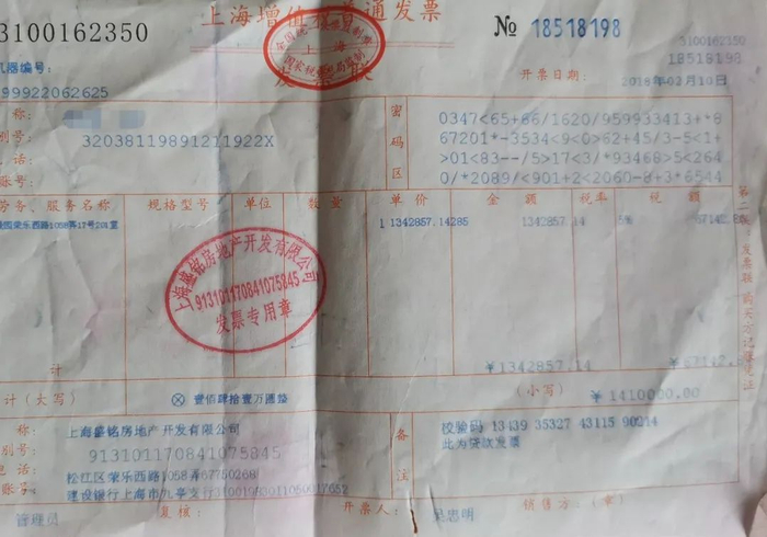 侍女士付了337万元买下松江区三盛颐景园2楼约90平方米住宅,2017年只拿到了开发商上海盛铭房地产开发有限公司签订的217万元购房合同,和217万元购房发票。120万元没有合同,没有发票,更没有说法。