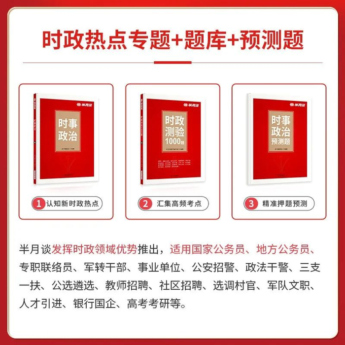 各位小伙伴们想在公考大军中脱颖而出,就离不开对国家大政方针政策、热点理论的学习。当然,最重要的是要学会学以致用,今天给大家带来了时政三本套,帮助规范文章的写作方式和特点,同时也汇集了8大专项的重要热点关键题,边学边练更容易掌握,让公考之旅通过热点妙笔生辉。