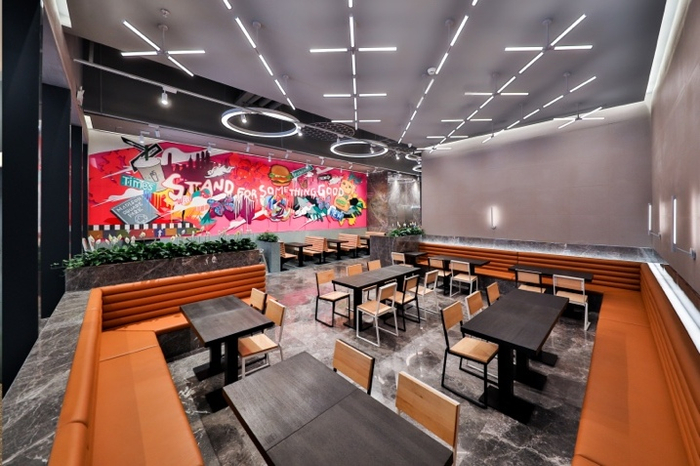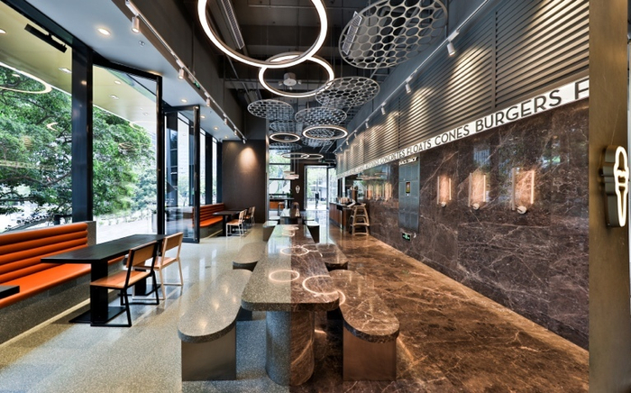 Shake Shack华南首店所在的万象天地位于深圳创新科技的南山区,是当地重要的潮流时尚与新派餐饮地标。受万象天地错落有致的布局启发,Shake Shack以浮岛为设计理念,以自然和科技为主题,利用不同色彩营造出充满碰撞感又具有包容性的室内空间,同时借助技术资源,创造出舒适的就餐环境,营造了一个温暖而惬意的社区共享空间。