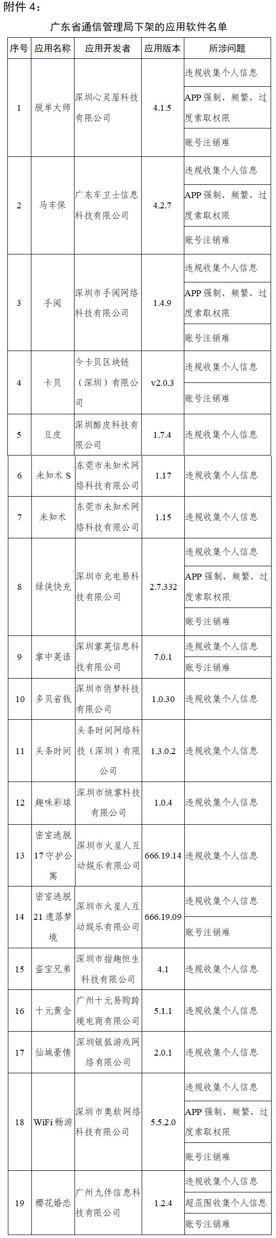 4月23日,工信部向社会通报了93家存在侵害用户权益行为APP企业的名单。据广东省通信管理局,尚有19款APP未按照要求完成整改反馈,根据相关规定,通知省内主要应用商店予以下架,并报请工业和信息化部在全国范围进行下架处理。