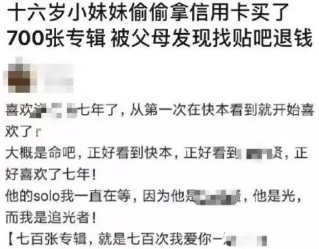 一个16岁的姑娘,为了“支持”偶像的新专辑,偷偷拿父母的信用卡刷了700张,还发在微博炫耀。