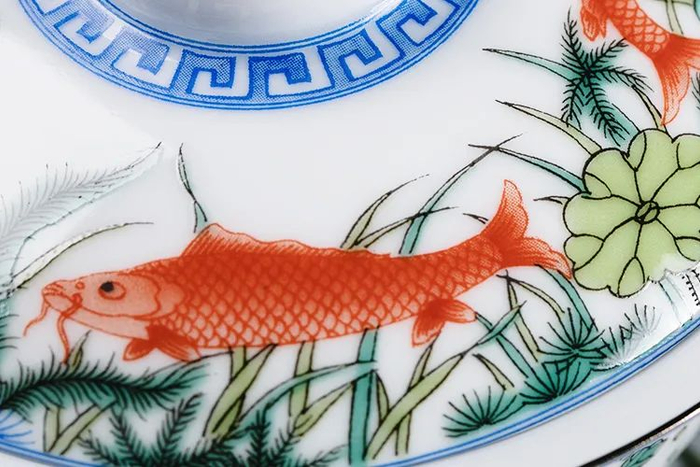 盖沿上还画了四条鲤鱼,寓意“四季有余”