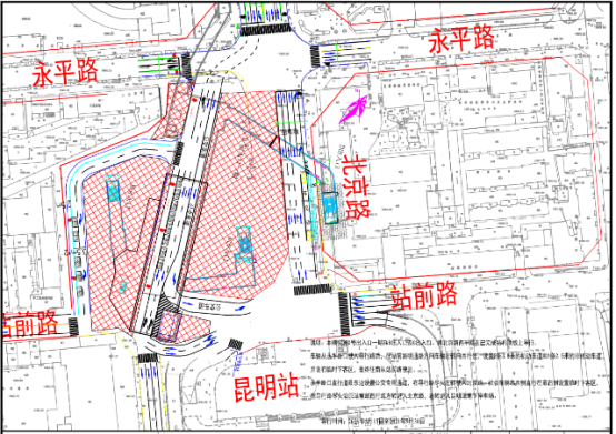 记者5月15日从昆明地铁建设管理有限公司获悉,昆明地铁2号线二期工程昆明火车站站附属结构一期交通导改施工5月16日起施行,时间约4个半月。施工围挡期间,请广大市民提前规划好出行线路,为避免拥堵尽量绕行。在该路段通行时请按照交通指示牌和现场交通管理人员指挥,文明出行,保证安全。