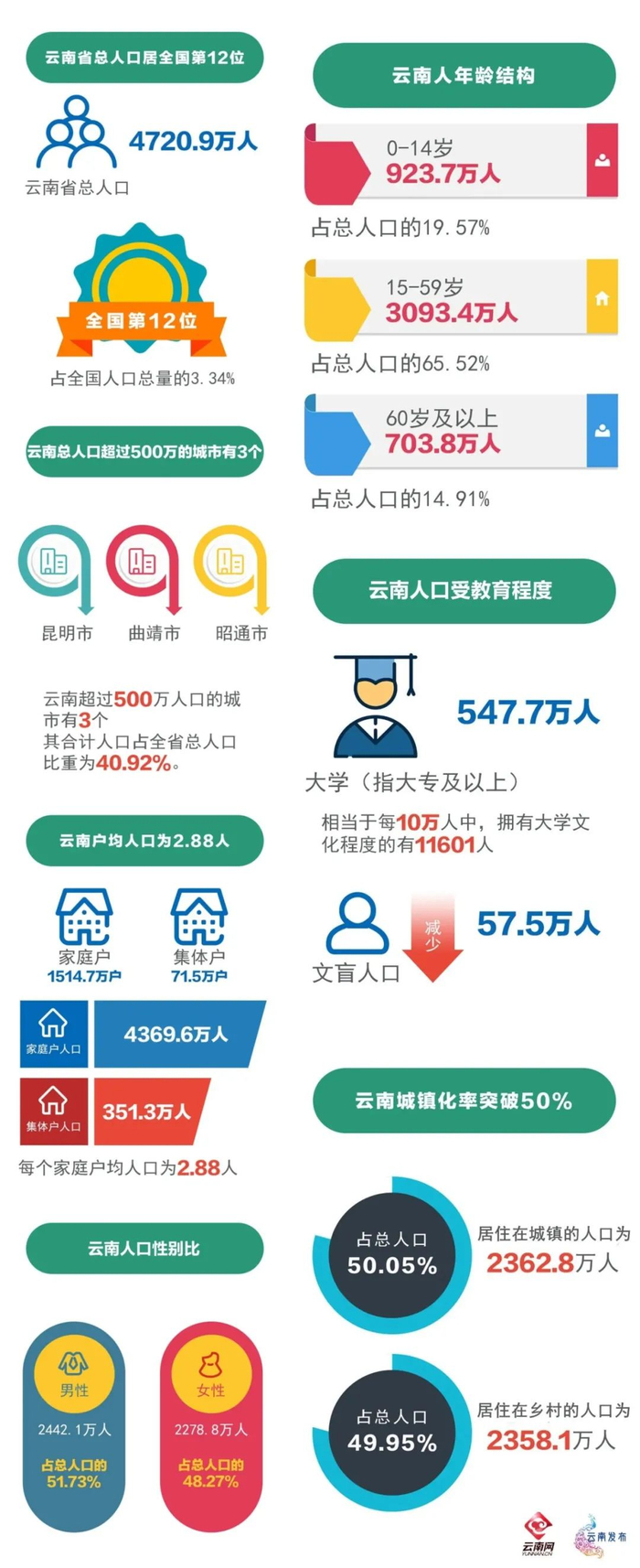 5月14日下午,云南省人民政府新闻办公室在海埂会堂召开云南省第七次全国人口普查主要数据结果新闻发布会,介绍相关情况并回答记者提问。近10年间,云南省人口总量平稳增长比2010年增加124.3万人,占全国总人口的3.34%,仍然排全国第12位。但从人口结构和质量上看,却出现许多新的变化趋势。