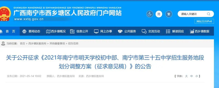 5月14日,南宁市西乡塘教育局发布公告,公开征求《2021年南宁市明天学校初中部、南宁市第三十五中学招生服务地段划分调整方案(征求意见稿)》。据悉,由于南宁市明天学校二期工程即初中部已建成,将于2021年秋季学期开始招生,该辖区个别初中学校招生服务地段相应进行调整,现征求社会公众意见。该城区其他小学的招生服务地段,跟去年一致。