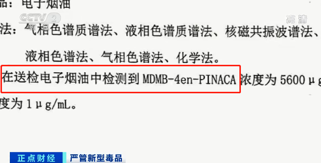 经北京一家毒检中心检测,电子烟油中检测出一种名为MDMB-4en-PINACA的物质,浓度为5600微克/毫升。