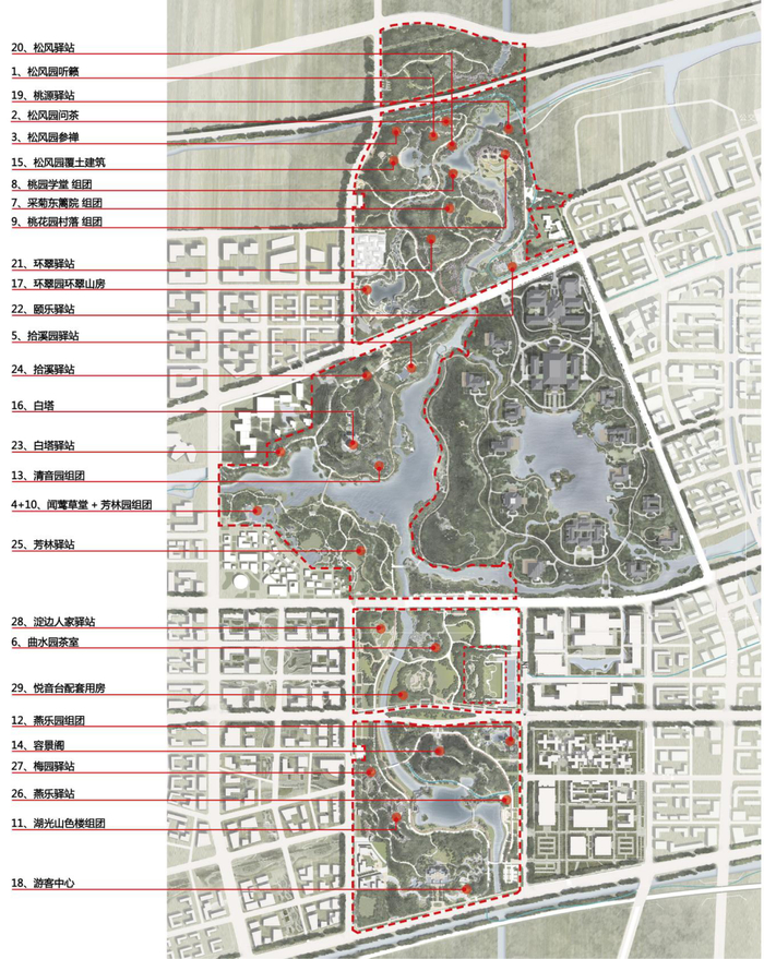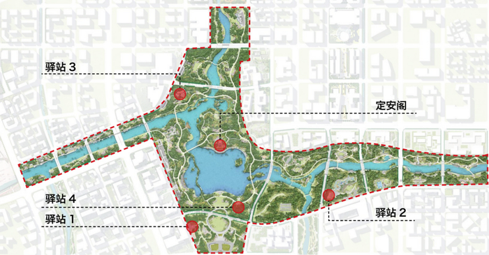 金湖公园中央湖区配套公共空间分为两类:(1)驿站类,共4座,每座建筑面积约250平方米;(2)阁式建筑1座—定安阁,建筑面积约800平方米。