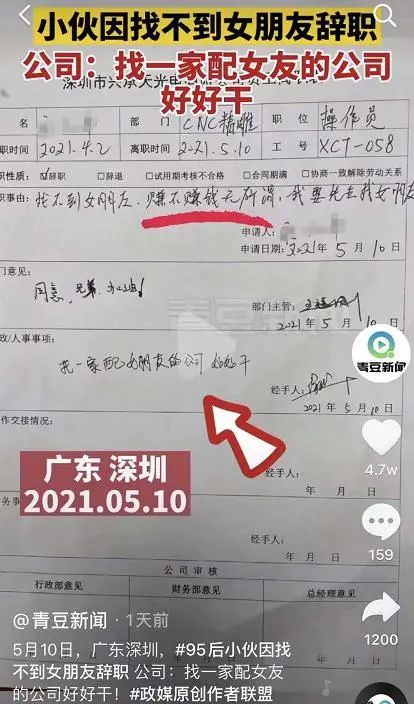 近日,深圳一95后小伙因找不到女友而辞职的理由火遍全网。5月10日,广东深圳。一家公司员工提交的辞职单引发网友关注。小伙子写的辞职事由是“找不到女朋友,赚不赚钱无所谓,我要先找女朋友。”部门主管在审批意见中写到“同意,兄弟,加油”。公司给的回复则是“找一家配女朋友的公司,好好干。”逗趣的回复逗乐了不少网友。(青豆新闻)