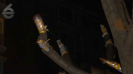 记者看到,所谓的把树枝重新处理了,就是在树枝切口处用塑料、胶带包裹起来,业主对此也发出质疑,修剪树枝的最佳时期应该是在冬季休眠期,而非现在。
