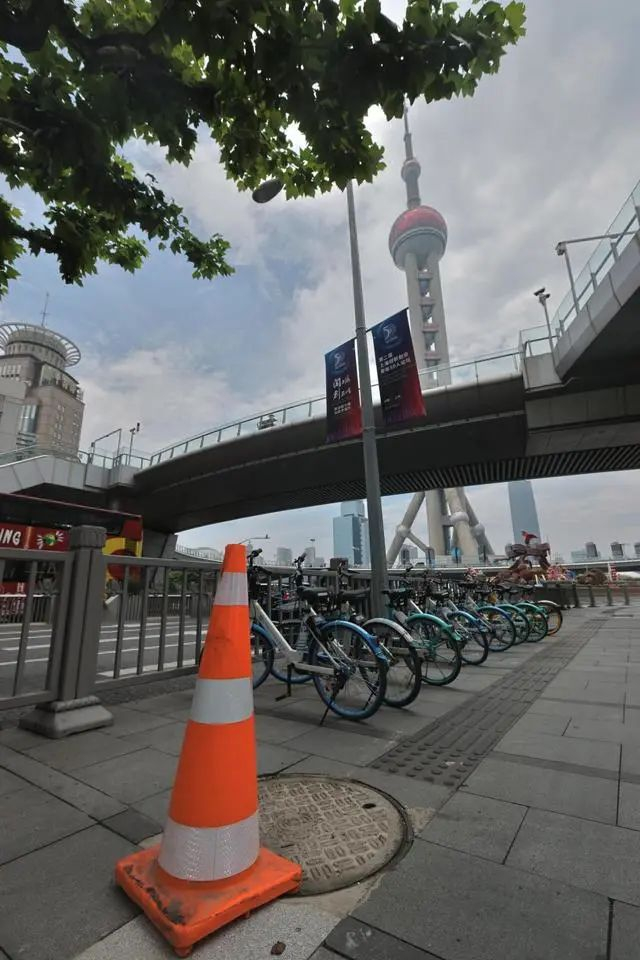 ↑5月15日,在上海市浦东新区陆家嘴环路,盲道被障碍物阻隔。