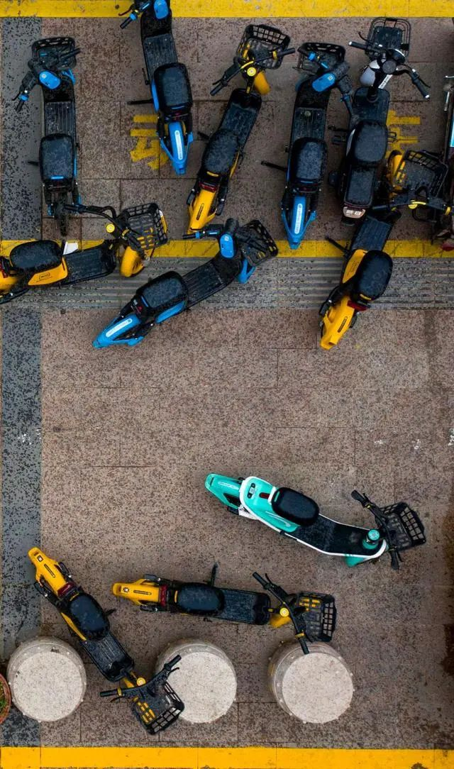 ↑在宁夏银川市凤凰商业广场附近,一段盲道上停放着一排共享电动车。