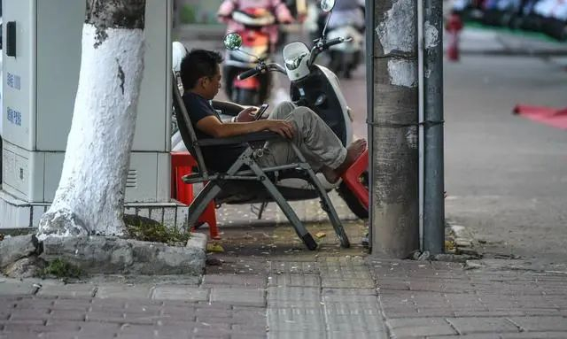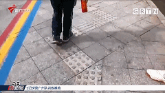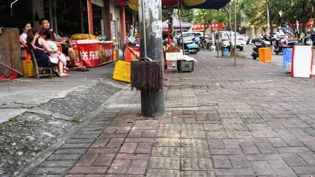 ↑在广西钦州市新兴街,一位市民占用盲道休闲。