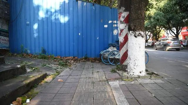 ↑在广西钦州市新兴西路,一处临时搭建的建筑堵住盲道。