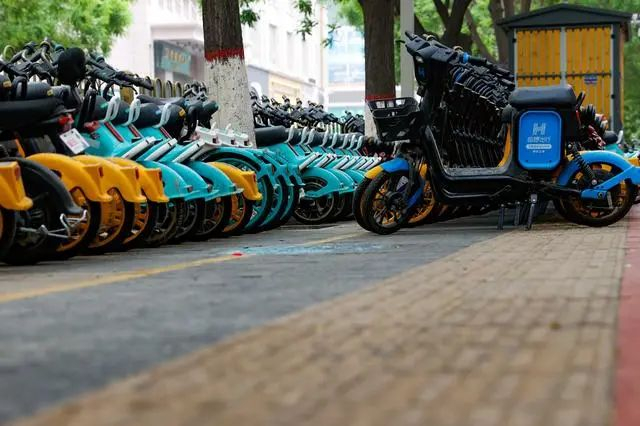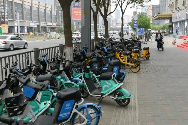 ↑在内蒙古呼和浩特市中山东路北侧,共享单车停放在盲道上。