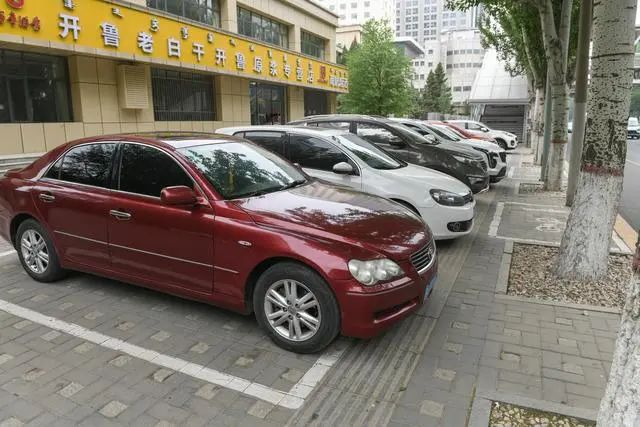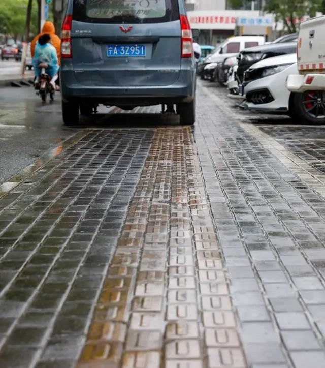 ↑在内蒙古呼和浩特市呼伦贝尔南路西侧,停放的汽车挡住了盲人步道。