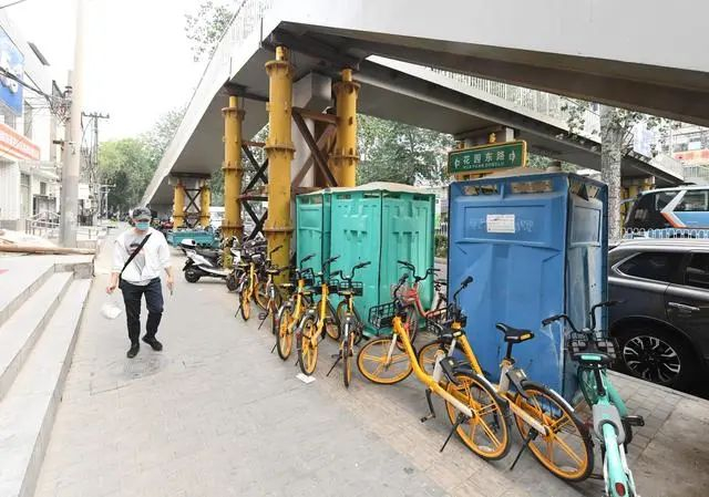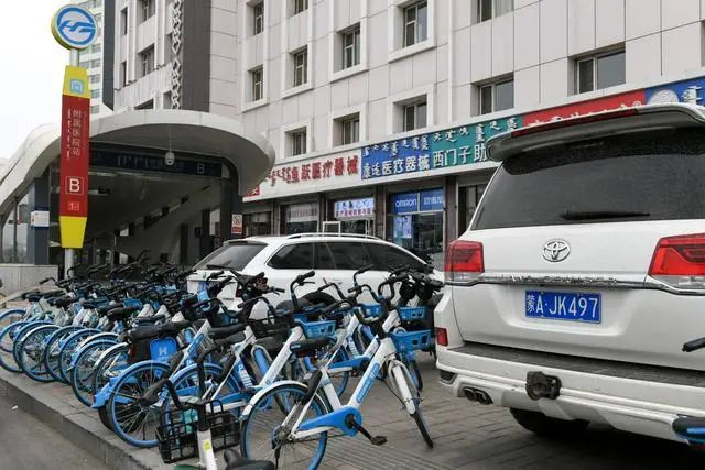 ↑在内蒙古呼和浩特市地铁1号线附属医院站B口南侧,多辆共享单车停放在盲道上。