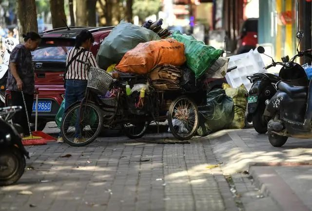 ↑在广西钦州市一条道路上,一名妇女占用盲道收废旧物品。