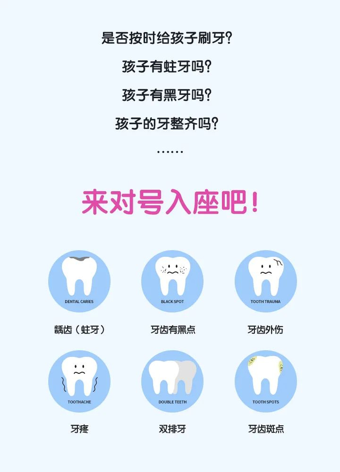 “儿童时期,孩子的牙齿还不足够坚固,口腔的自我防护机制没有充分建立,经常会产生一些口腔问题。轻则给孩子带来疼痛,严重的甚至可能会影响到儿童的牙齿发育,这将是伴随孩子一生的牙齿问题。因此,每隔3~6个月定期做一次口腔检查,做到早发现早治疗!”