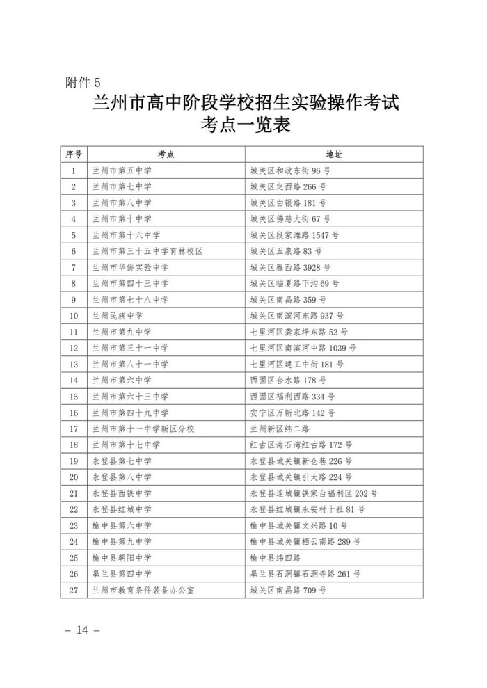 我市城市四区、兰州新区的实验操作考试由兰州市教育条件装备办公室统一组织;远郊区县的实验操作考试由各远郊区县教育局以区县为单位统一组织;高新区连搭中学的学生由榆中县教育局安排在榆中县考试,兰州七十八中东城分校的学生在城关区考点参加考试。