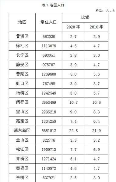 分区域看,与2010年第六次全国人口普查相比,中心城区人口所占比重减少3.4个百分点,浦东新区人口所占比重增加0.9个百分点,郊区人口所占比重增加2.5个百分点。