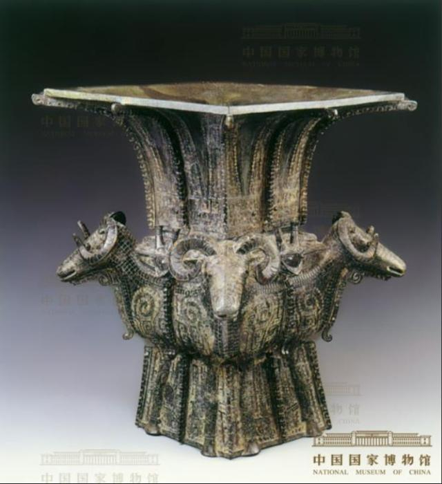 从体型上看,它在现存商代青铜方尊之中体型最大。造型构思相当大胆,肩部、腹部与足部作为一体被巧妙地设计成四只卷角羊,栩栩如生,各据一隅,足见当时工匠的实力。