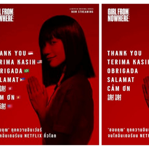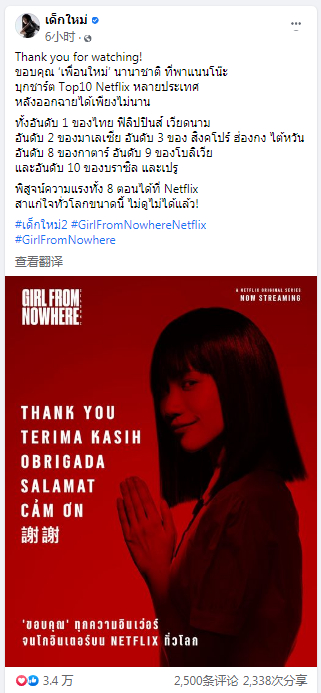 “感谢收看!上映后不久,《禁忌女孩》在很多国家的Netflix(网飞)榜都进入了前十。在泰国、菲律宾、越南排第一,在马来西亚排第二,在新加坡、香港、台湾排第三,在卡塔尔排第八,在玻利维亚排第九,在巴西和秘鲁排第十……”