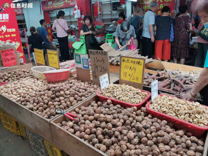 核桃10元/斤、独子蒜11元/斤、金仓鱼15元/斤……档主们习惯给每一样商品都明码标价,商品价格一目了然,方便街坊们选取。穿梭在这里,可以看到不少阿叔阿姨或是拖着买菜的小推车,或是背着硕大的购物袋,挤在人群中,在摊位前挑挑拣拣,与档主讨价还价。虽然市场面积不算很大,但人挤人,肩靠肩,记者在鸿福市场兜上一圈也要花上不少时间。