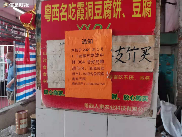 档口招牌、宣传海报……市场墙面上,留下了曾经的档口经营过的痕迹,还有一些由原档主自发贴上示的搬迁通知。从搬迁通知上可以看到,虽然市场关停,但这些档主却没有选择搬远,而是选择继续在龙津肉菜市场附近龙津中路、鸿福市场一带经营。