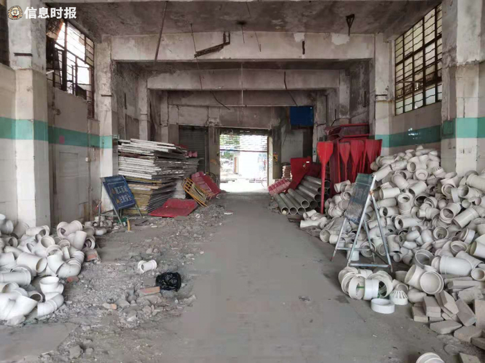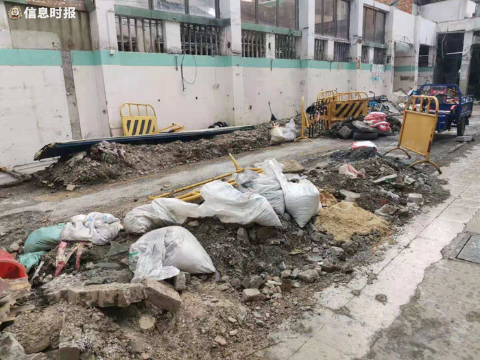 5月17日上午,记者走访龙津肉菜市场发现,这里的市场招牌依然显眼,但偌大的菜市场里却空空荡荡,原先的档口都已经撤离。从市场大门走进去,可以看到里面堆积着水泥、警示牌、水管等施工材料,部分已经挖开的沟渠被铁马护栏盖住,一副施工现场的模样,但现场没有见到有施工人员。