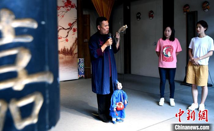 福建省泉州市木偶剧团二级演员吴伟宏(左一)向观众介绍泉州提线木偶戏的表演技艺。 记者 刘可耕 摄