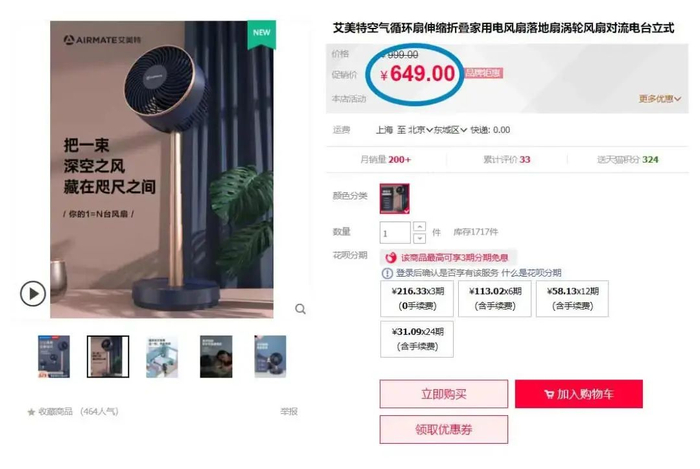 宠粉如我,今天一如既往带来粉丝特惠福利价......现在购买,原价649元的艾美特无线折叠循环扇,立减180元,只要469元。