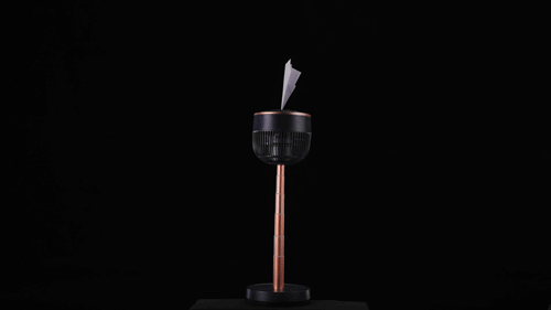 正面吹出来的风呈螺旋状,风力强劲且聚集不发散,纸飞机放在风扇头中间,也可以平稳旋转。