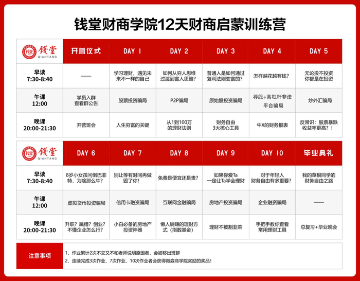所以,为了能让更多人像开头的大妈一样抓住机会,我特地请来鸿程老师所在的团队“挖财钱堂学院”,他们专为小白研发一套【12天财商启蒙训练营】