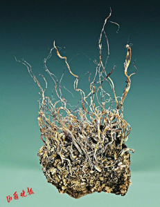 自然银为天然形成的银单质矿物,十分珍贵稀有。山西产出的自然银多呈发丝状,特征鲜明,在国际矿物晶体界有较高的知名度。该标本产于山西灵丘,高18厘米,宽10厘米,重约843克,是目前发现的体量最大、银丝最为密集、形态最为优美的山西自然银标本,堪称“山西银王”。
