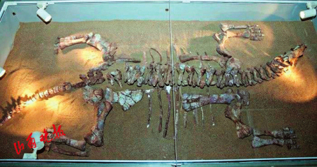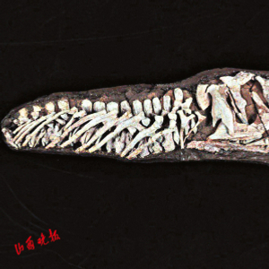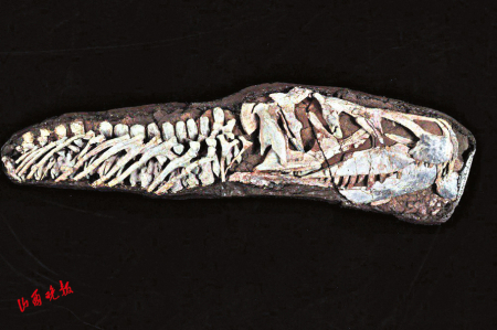 山西山西鳄生存于三叠纪时期,是一种凶猛的肉食性爬行动物,处于中国肯氏兽动物群的食物链顶端。该标本由山西地质博物馆工作人员发掘于山西吉县,标本长约1.7米,包括有完整的头骨、6节颈椎、8节背椎,该标本是世界上保存最完整的山西山西鳄标本,对于补充完善山西山西鳄生物信息具有重要的研究意义。
