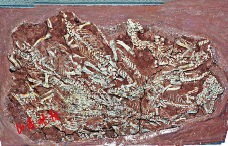 择义王氏鳄生存于三叠纪中期,是一种小型的肉食性爬行动物,是中国肯氏兽动物群中的重要一员。该标本由山西地质博物馆工作人员发掘于山西榆社,并历经两年的精细修复。标本由十多个密集分布的个体组成,其骨骼保存完整、清晰,关联性较好,是迄今为止世界上发现的同类化石中个体数量最多、完整程度最高的标本。