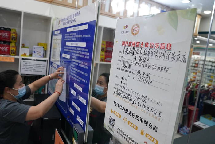 记者在位于宋家庄地铁枢纽附近的首开福茂商业综合体地下一层的超市门口看到,服务台明显的地方贴着一张预付费式经营主体公示信息,上面写清了商家名称,租赁合同到期日期,遇到纠纷投诉电话等信息,并提醒广大消费者谨慎选择预付费式消费模式。这样的公示信息在商场里每家采取预付费消费的店铺门前都有。