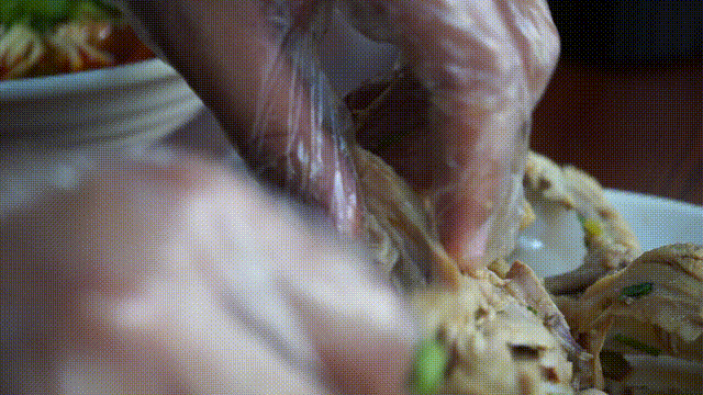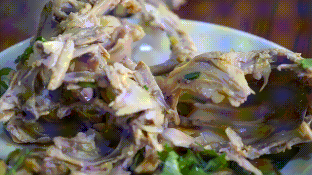 用鸡汤熬煮出的鸡架,闻起来香而不腻,搭配上榨菜末、香菜末再来点辣椒油,完美!吃之前,必须要有一个简单而又复杂的过程,那就是拆鸡架。