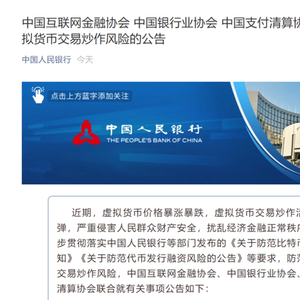 鉴于此,中国互联网金融协会、中国银行业协会、中国支付清算协会5月18日联合发布公告,要求会员机构不得开展虚拟货币交易兑换以及其他相关金融业务,坚决抵制虚拟货币相关非法金融活动,不为虚拟货币交易提供账户和支付结算、宣传展示等服务,同时提示社会公众加强风险防范意识,不要参与虚拟货币相关交易炒作活动,谨防个人资金受损。