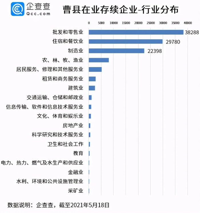 企查查数据显示,批发和零售业、住宿和餐饮业以及制造业是曹县企业数量最多的三个行业,分别有3.83万家、2.98万家和2.24万家。这三大行业占整体的比重高达78.07%,可以说是曹县经济发展的支柱性产业了。