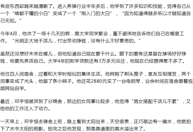 邓宇恒依然坚守在猪场。他不时会陷入迷茫。想到同学朋友在外面工作,下班以后能去吃烧烤和火锅,他不知道自己还应该在猪场待多久,也不知道今后又该做什么。