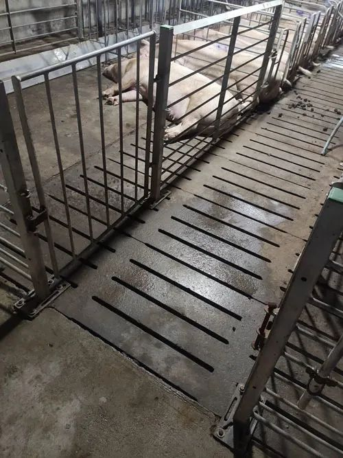产前倒数第四天,被冲洗干净的怀孕母猪要被赶到分娩舍,也叫产房。“相当于医院的妇产科。”在湖北一家猪场分娩舍工作的张尧说。这里的产床比在配怀舍的定位栏宽敞,母猪可以侧卧着喂奶,产床的定位大架上装有挡杠,防止小猪被母猪压死或踩伤。产房里的温度保持在25-28摄氏度,装有保温灯和热风机等。为了不让小猪受凉,地面漏缝板上还要铺上木板,阻挡粪池里的凉气。