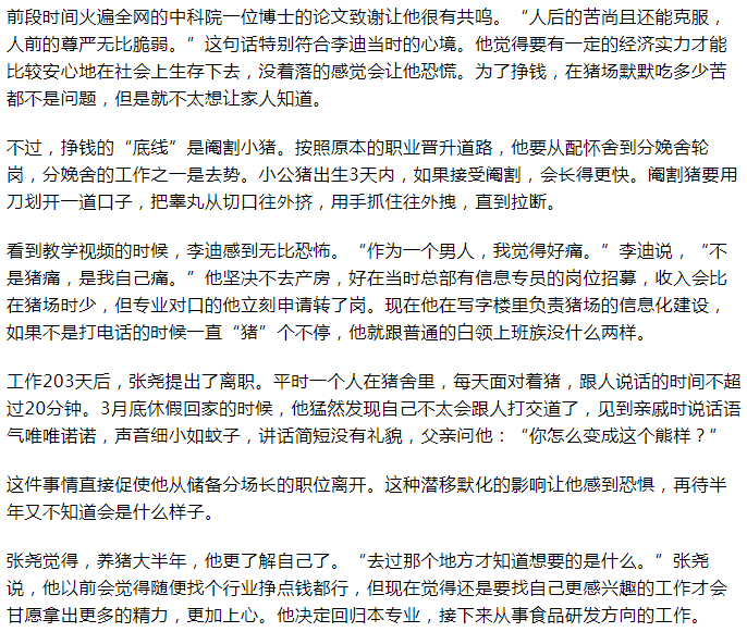 招聘启事明明白白地写着,农村孩子优先。有人被录用之后被家里人拦下,还有人进猪舍铲了1小时猪屎就决定“跑路”。有坚持下来的人在网上真诚地劝退:“耐不住寂寞、熬不住清冷、吃不了苦、调整不好心态者慎入。”