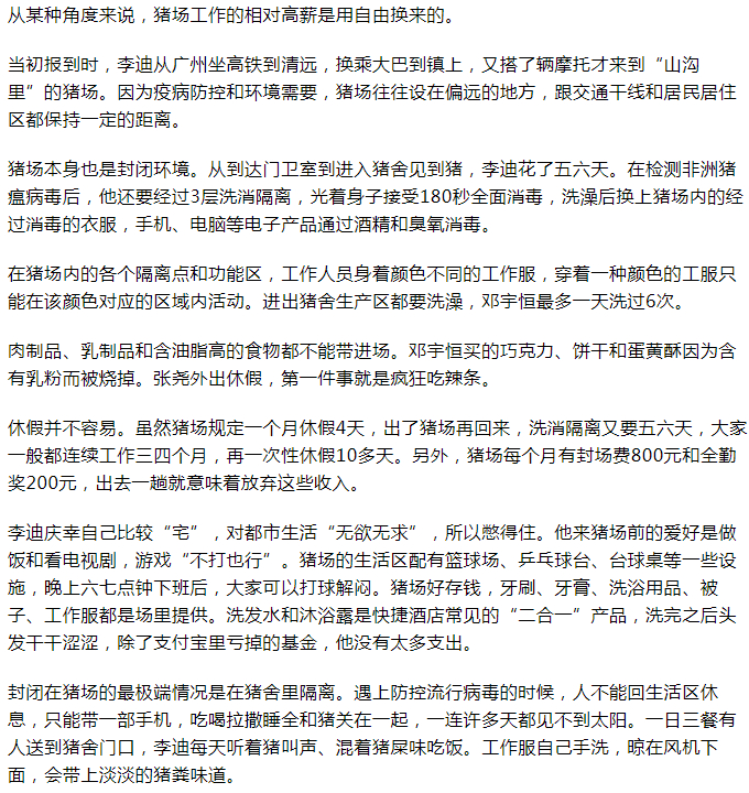 李迪毕业于广州一家非重点本科院校,他自认为成绩不够好,就业环境又受新冠肺炎疫情影响,广州的互联网小公司给他开出的工资每个月不到3000元。相比之下,底薪6000元且包吃住的养猪工作太有吸引力。