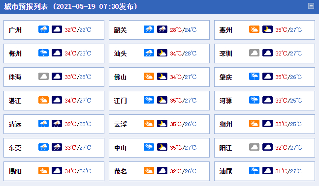 19日,韶关、清远、肇庆多云到阴天,有中雷雨局部大雨,其余市县多云间晴,有分散雷阵雨。最高气温:韶关、清远、肇庆北部27~29℃,粤东的北部、雷州半岛33~35℃,其余市县30~33℃。